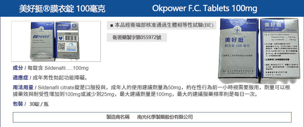 美好挺 OKPOWER 100mg 瓶裝版 是針對男性性功能障礙所設計的速效型壯陽產品,主要成分為西地那非(Sildenafil Citrate),為PDE5抑制劑類藥物,與威而鋼相同機轉。產品採用瓶裝包裝,內含多顆定量錠劑,方便攜帶與長期使用,特別適合有周期性需求的男性族群使用。